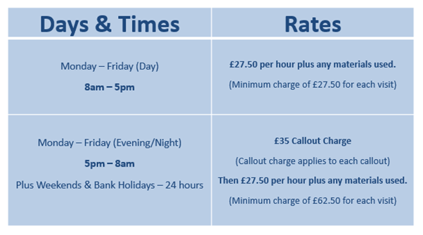 We offer a very reliable service with low hourly rates as you can see set out below.